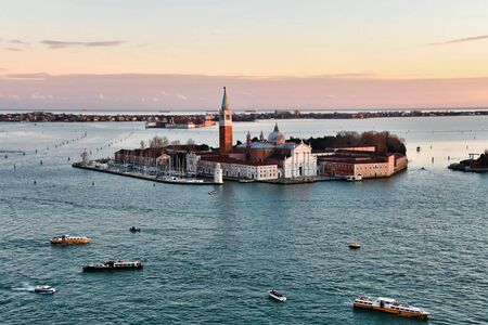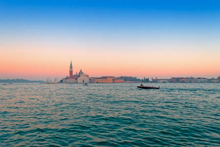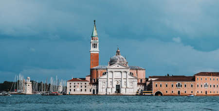 View to San Giorgio island in Venice, Italy. Opposite view. San Giorgio Maggiore Church and tower behond. Beautiful blue and lagoon colors.