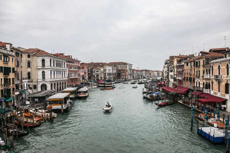 View of the famous Grand Canal in Venice, Italy. Historic Venetian canal in daylight with boats and old traditional buildings on the side