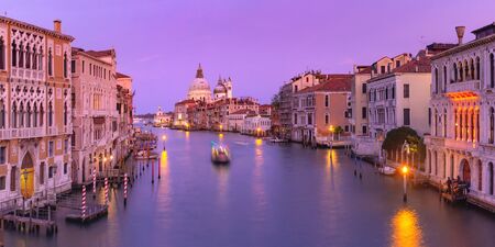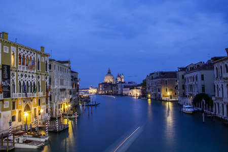 Grand Canal in Venice, Italy with Santa Maria della Salute Basilica in the background at twilight
