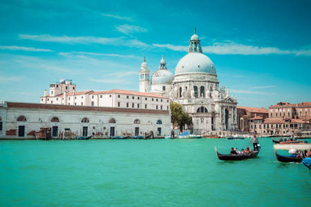 Venice view on Santa Maria della Salute basilica and gondolas on the Grand canal. Famous tourist attraction, summer city trip
