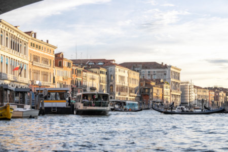 Blur Views of grand canal with boats, gondolas, mansions along. Venice, Italy.
