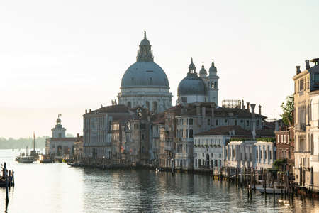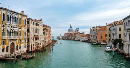 Exceptional typical view of the Island of Venice in Italy with the Grand Canal and the Dome of the Church called Madonna della Salute in Italy with few boats due to the lockdown caused by the Coronavirus