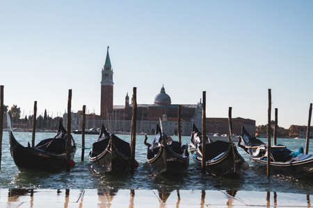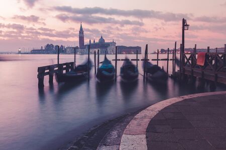 Venice classic sunrise view with gondolas on the waves. Venice, Italy