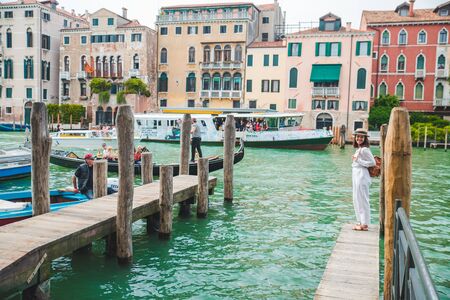 Venice, Italy - May 25, 2019: woman walking by wooden pier looking at grand canal at venice gondolas boats