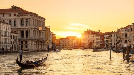 Venice at sunset, Italy. Gondola with tourists sails on Grand Canal at night. Panorama of Venice city in evening sunlight. Scenery of sunny street in the Venice center. Nice urban landscape at dusk.