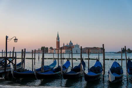 Gondolas and San Giorgio Maggiore church at sunset, Venice, Italy