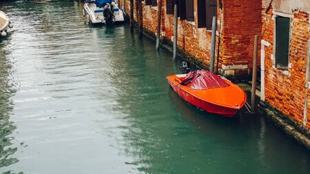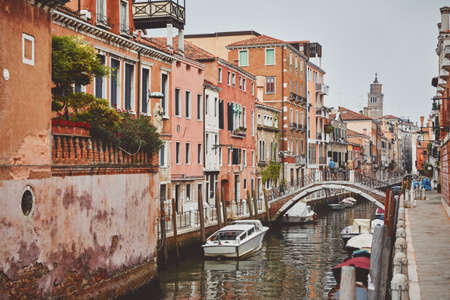 Italy - nov, 2021. The cityscape and architecture of Venice. Urban canal and boats on it. high quality photo