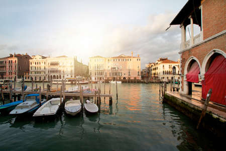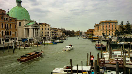 Grand channel in Venice, Italy. Beautiful shot of the buildings on the water. Cloudy weather. Many boats and gondols. Parking places for the boats. Perspective of the city.