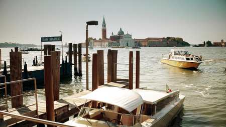 View on San Giorgio Maggiore island in Venice with a water taxi in front