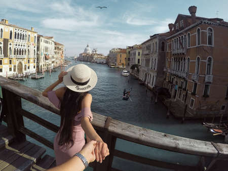 Follow me. View on Grand canal with woman traveler in hat on Academia bridge in Venice.