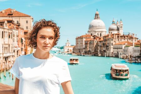Portrait of a charming girl with a view of santa maria della salute. Travel and vacation concept. Mixed media