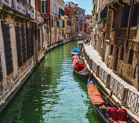 Venice, beautiful romantic italian city on sea with great canal and gondolas. View of venetian narrow canal. Venice is a popular tourist destination of Europe.