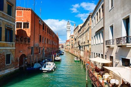 Scenic view from the narrow water canals in Venice with he leaning bell tower (Campanile di San Giorgio dei Greci) of Church of San Giorgio dei Greci