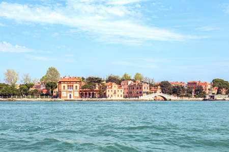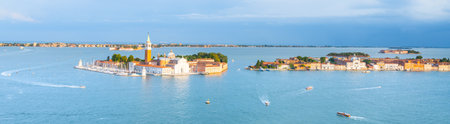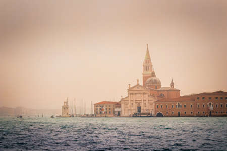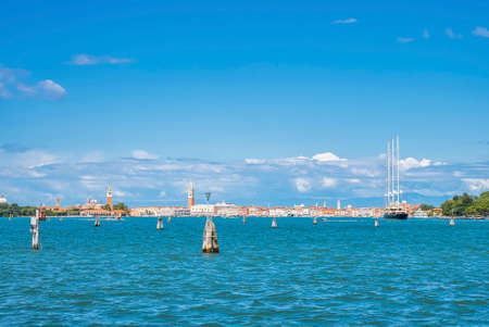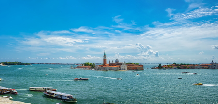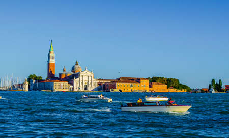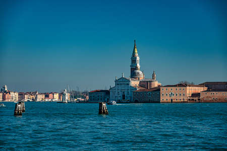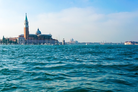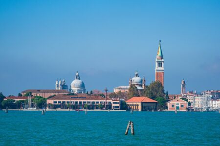 View to San Giorgio island in Venice, Italy. Opposite view. San Giorgio Maggiore Church and tower behond. Beautiful blue and lagoon colors.