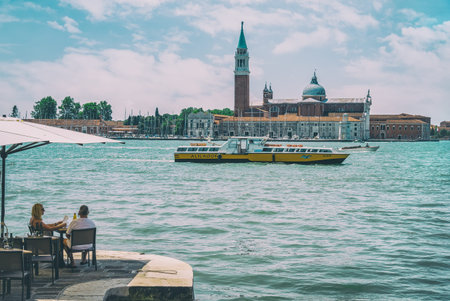 Venice, Italy - May 30 2023: Tourist couple enjoying the idyllic scene on Grand Canal in Venice.