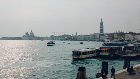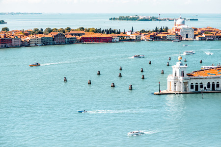 landscape of the pier area in Venice, Italy seen from a boat on a sunny day