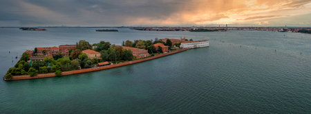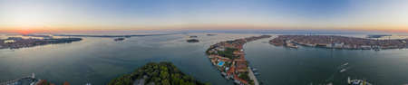 Aerial drone panorama of the lagoon of Venice and Lido island during sunrise in summer
