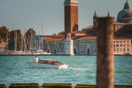 Lagoon of Venice on a sunny day with a water taxi passing by