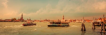 Venice Italy - May 25, 2019: Panoramic view of Venice at sunset in a summer evening. Boats with torurists sail on the Gran Canal.