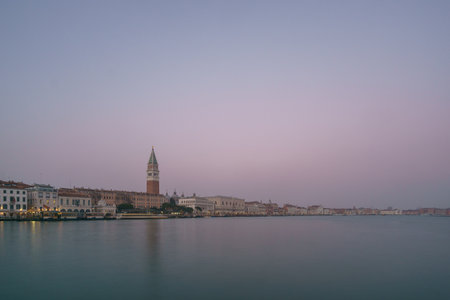 Panoramic view from sea of Piazza San Marco Campanile and Doge Palace on a hazy winter evening, Venice, Veneto, Italy