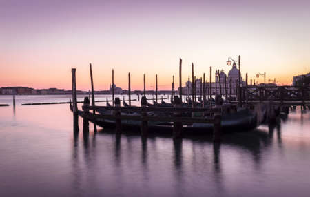 Gondola or boat parked in the canal in Venice, with churches and houses next to the waterway are seen in early evening.