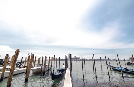 Gondolas on Grand Canal in Venice in foggy morning. Gondola service for tourist travel around Venice in Italy. Springtime. Copy space for text