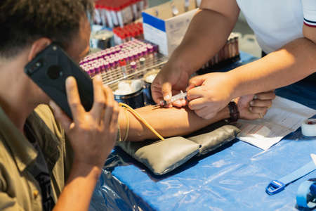 A Healthcare Professional examines the veins in the Donor's arm before taking blood. Health care and medicine concept.