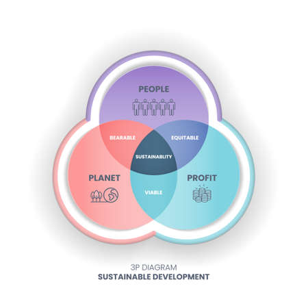 The 3P sustainability vector diagram has 3 elements: people, planet, and profit. The intersection of them has bearable, viable, and equitable dimensions for the sustainable development goals or SDGs