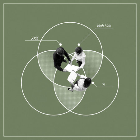 Three circles with different people overlaps with each other as symbol of consensus of opinion
