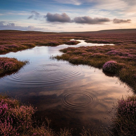Sunset on the moorland with blooming heather flowers