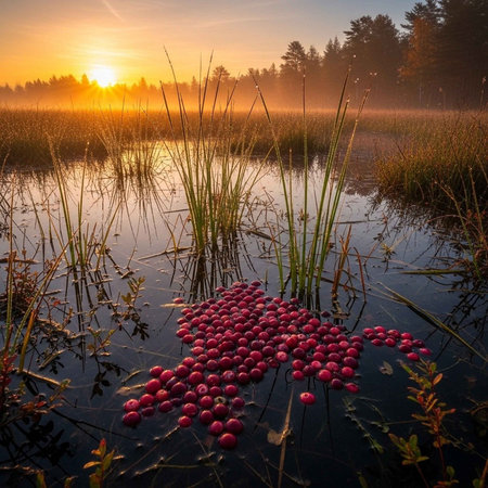 Ripe red cranberries on the surface of the lake at sunrise