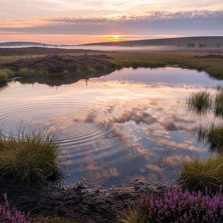 Sunrise over a lake with purple heather in the foreground.