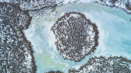 Aerial view of the frozen brook in winter. The texture of icy creek. Nature background