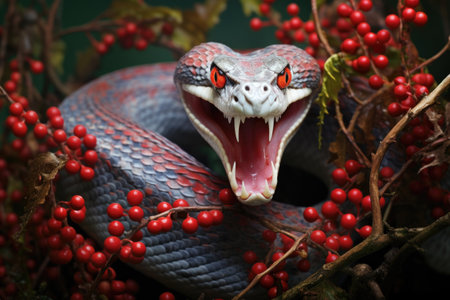 Captivating close-up of a striking snake with an open mouth revealing sharp fangs