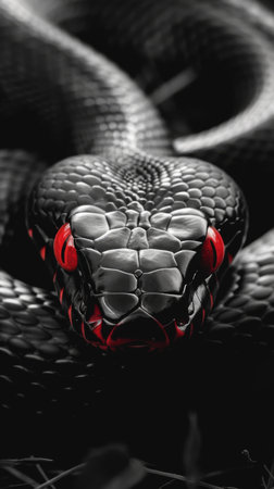 black mamba stares intently at the camera, its black scales shimmering in the light. The snakes red eyes are piercing, revealing its predatory nature.