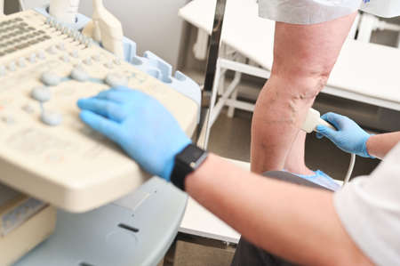 Orthopedist doctor doing ultrasound examination of patients leg veins in his office