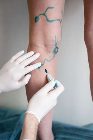 Vein markup. Vascular surgeon is marking veins for varicose surgery.