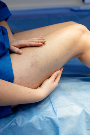 The vascular surgeon examines the outer thigh where the varicose veins are present. Preparation for laser treatment and sclerotherapy. The concept of treating varicose veins at an early stage.