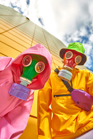 Stop environmental pollution. A couple of modern young people in bright clothes and gas masks stand by a yellow industrial wall. Modern art.