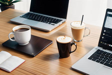 Two steaming cups of coffee with heart-shaped latte art sit on a cluttered desk scattered with papers and documents, casting a warm glow in a dimly lit room.. AI Generation