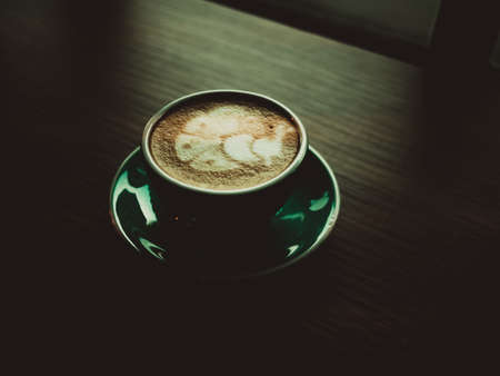 Hot coffee late art in cup on table, image vintage.