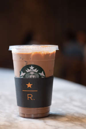 Samut Prakan, Thailand - February 4, 2020 : Starbucks Mocha coffee cold beverage on table, famous coffee brand franchise originated in USA