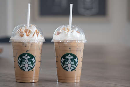 Bangkok, Thailand - February 17, 2020: Two cup of Starbucks ice coffee with whipped cream in Starbucks coffee shop for promotion buy 1 get 1 free. (Selective focus)