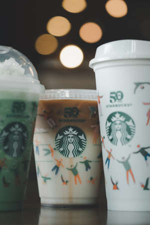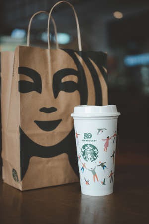 Bangkok, Thailand - October 25, 2021 : A reusable cup for hot drinks a special 50th Anniversary design reusable cups will be offered for free to Starbucks customers. Illustratative editorial