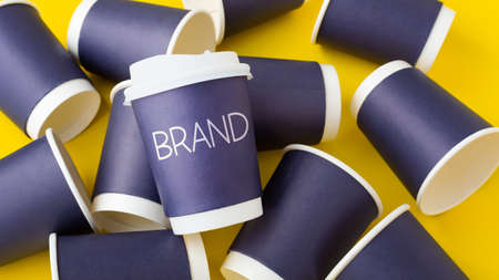 Coffee branding mockup, blue paper coffee cup with brand word on yellow background