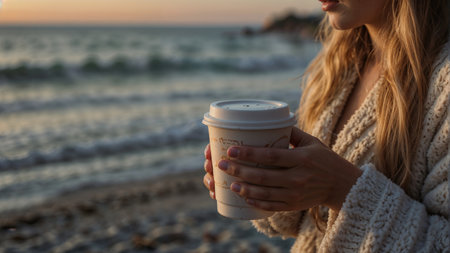 Close up of a woman holding a paper cup of coffee on the beach