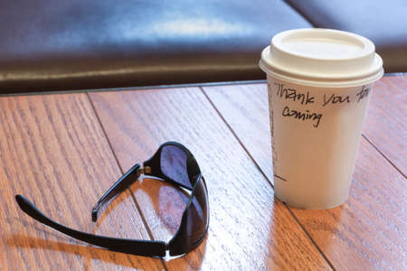 Coffee cup for take away in coffe shop table with a black sunglasses, to say thank you to a freind.