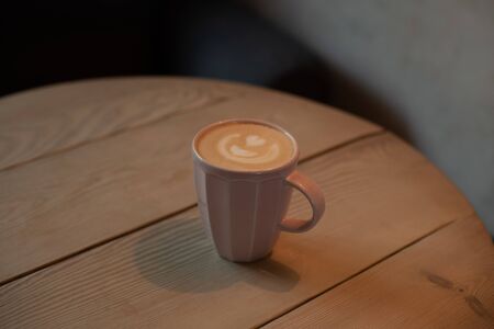 A Cup of hot cappuccino coffee on wooden table. Cappuccino with latte art in a beautiful cup on the table in a cafe. Selective focus. At home. Time for relax. Pink cup with latte on the table