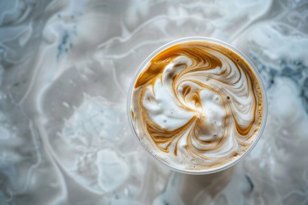 A cup of coffee with a swirl of cream on top. The swirls are brown and white, and the coffee is hot. Concept of warmth and comfort
