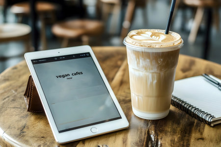 Tablet with search for vegan cafes next to iced coffee and notebook on rustic wooden table in cozy cafe.